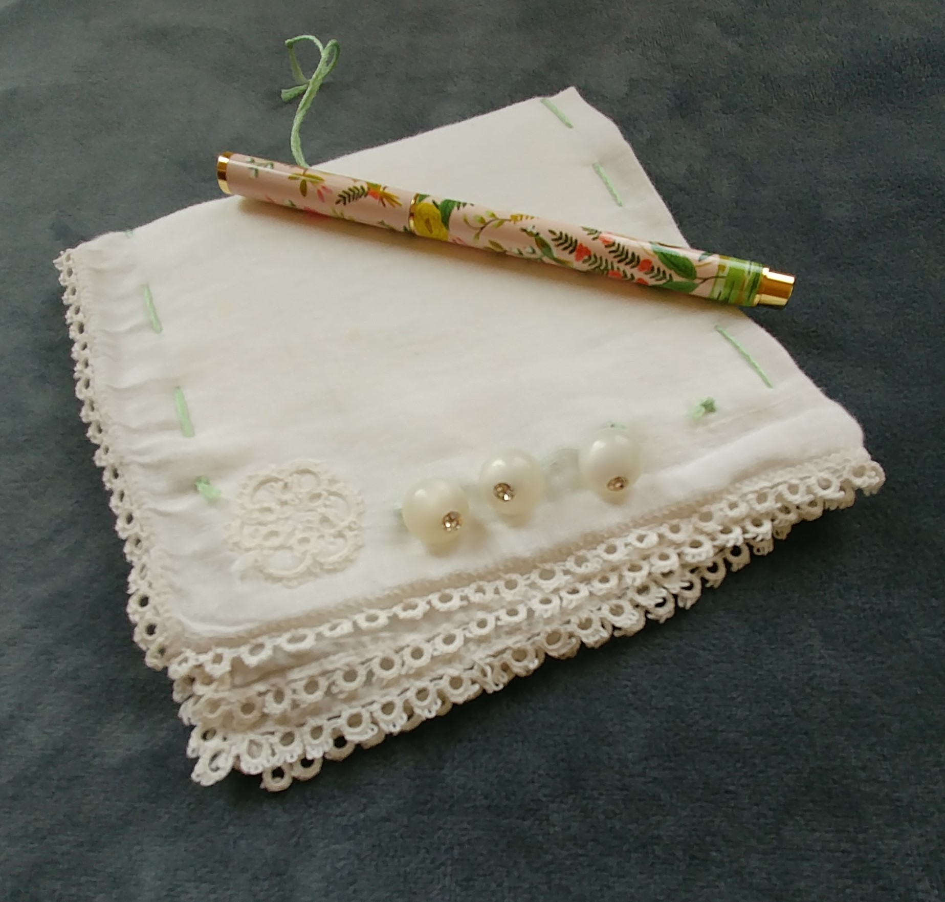 ![]() Remember Those handkerchiefs your grandma used instead of disposable tissues? Her button box? These notebooks are made of handkerchiefs I've been given or have found in "antique" shops and buttons from my mother's and grandmother's and mother-in-law's button boxes. Handkerchiefs are often "rescued" since they have holes or stains. I work with those because I am most interested in preserving the decorative stitching and patterns. Each handkerchief is folded over a piece of card stock to make up for any weaknesses in the fabric. Price: $16 each (tax included) |