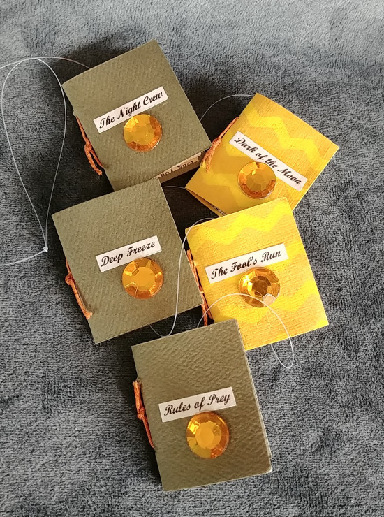 Danglies by Author Each string contains five titles by a particular author. In the center of each little book is the first sentence of that title. |